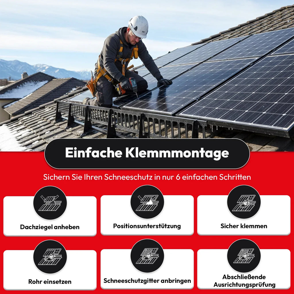 Klemm-Montage: Ohne zusätzliche Befestigungsteile extrem einfach und schnell zu montieren. Keine zusätzliche Montageplatte erforderlich: Universal PV Schneefangstütze Photovoltaik im Wasserlauf über Dachziegel / Dachpfanne und Dachlatte einhängen, fertig. Klemmeffekt garantiert festen, sicheren Halt. Für Neubauten und Dachnachrüstungen geeignet.